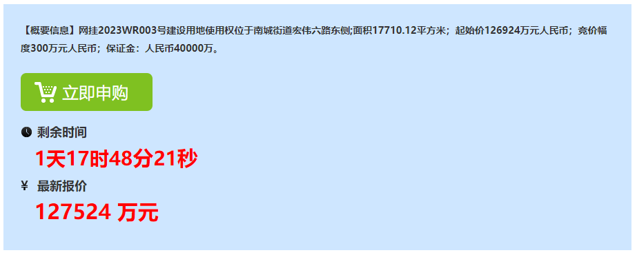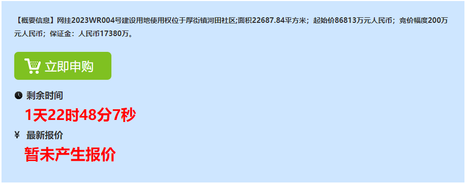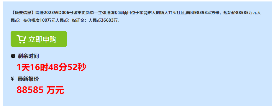 东莞市公共资源交易网显示,位于大朗镇大井头社区的旧改项目(2023WD006),已有产生报价。如无意外,项目将于后天(6月28日)如约摘牌。