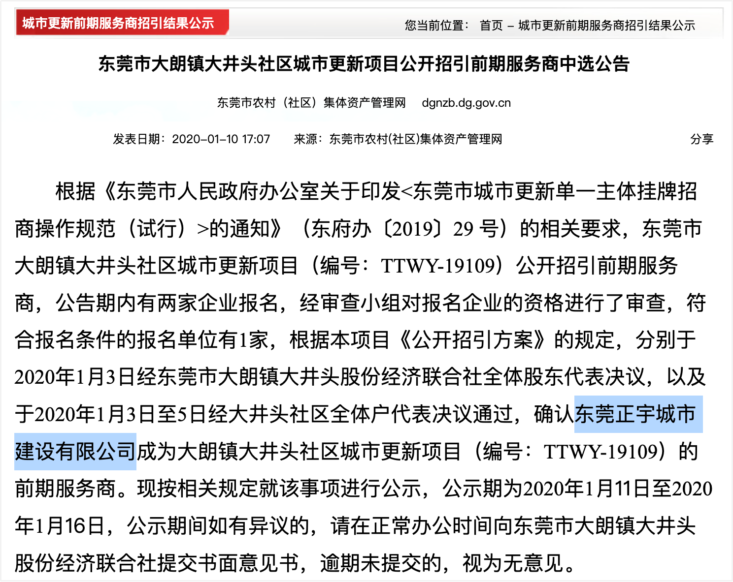 笔者查询到,项目早在2020年确认前期服务商,中标企业为东莞正宇城市建设有限公司。