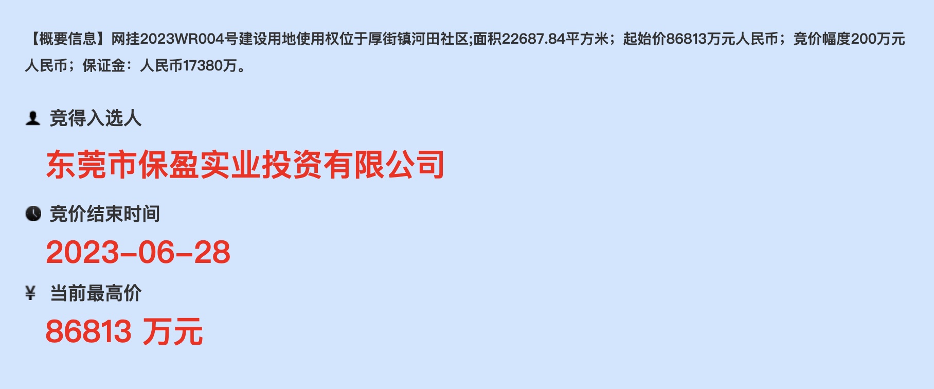 位于厚街河田社区的地块,在今天是最后登场,最终由东莞市保盈实业投资有限公司拍得,成交总价约8.68亿元。