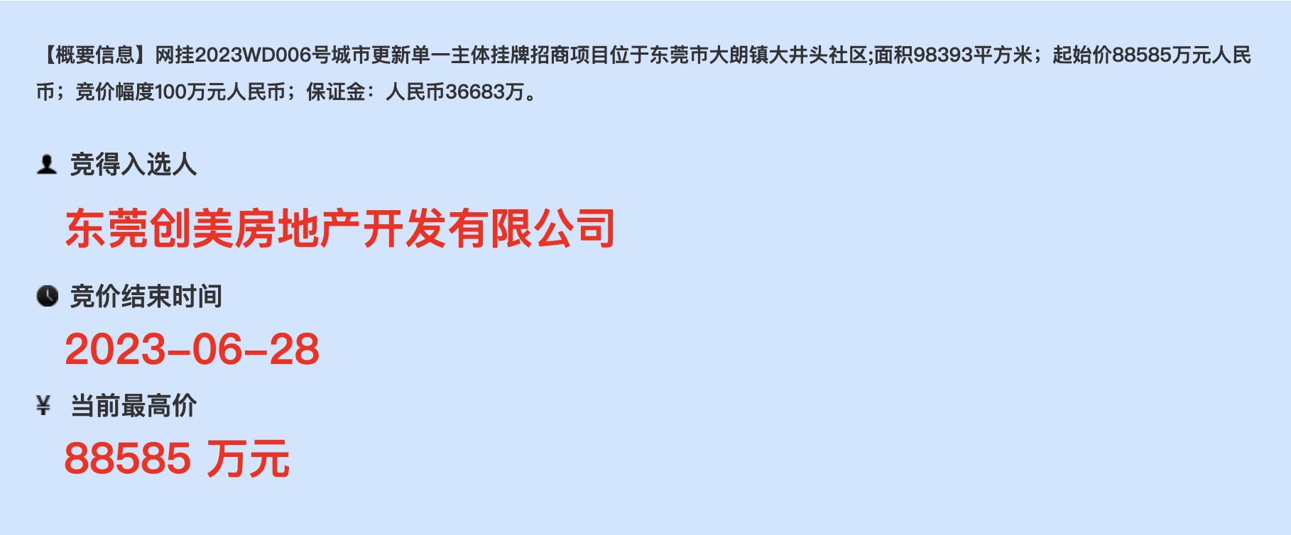东莞市公共资源交易网显示,位于大朗大井头社区美景东路的旧改项目,由东莞创美房地产开发有限公司摘牌,成交总价约8.85亿元。