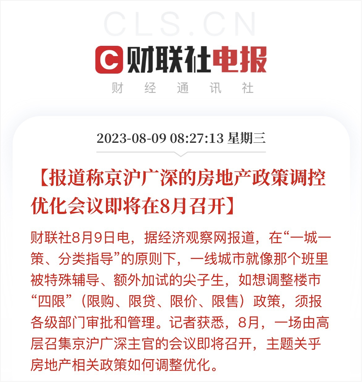 今日(8月9日),财联社一则电报指出,一场由高层召集京沪广深主官的会议即将召开,主题关乎房地产相关政策如何调整优化。