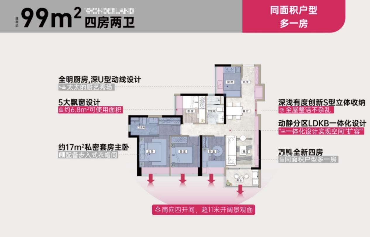 卧室数量方面,有些新盘在不到100m²的户型,做到了4房。这样刚需就能以较低的价格,满足进阶式的居住体验。