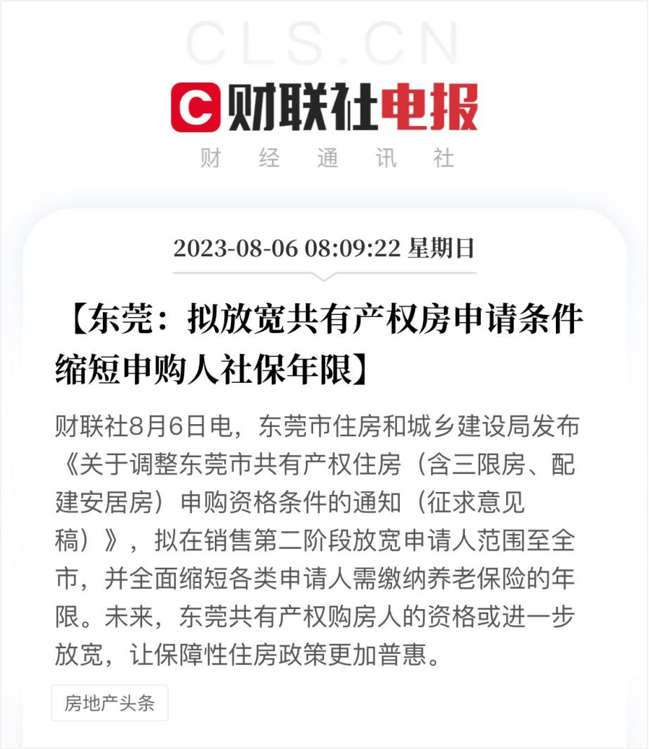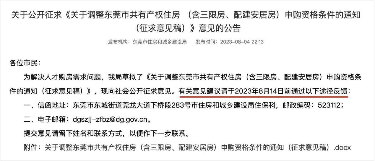 日前(8月3日),东莞市住建局发布了《关于调整东莞市共有产权住房(含三限房、配建安居房)申购资格条件的通知(征求意见稿)》。