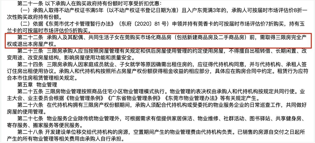 而且,在未取得完全产权或退出本房屋产权的情况下,承购人及其配偶、共同生活子女无法在莞购买商品房(包括新房、二手房)。
