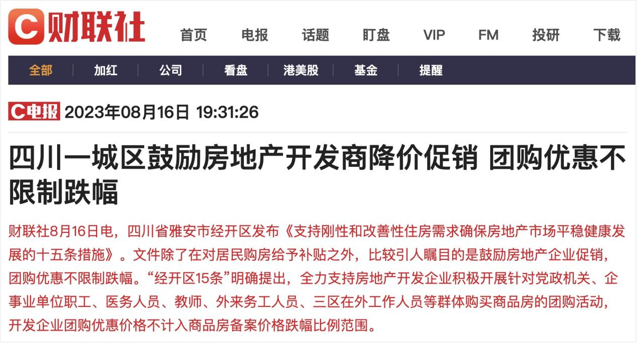 另外,继上月福建邵武发声后,本月四川雅安也明确支持/鼓励开发商开展团购活动,相关优惠不计入商品房备案价格跌幅比例范围,变相放宽“限跌令”。
