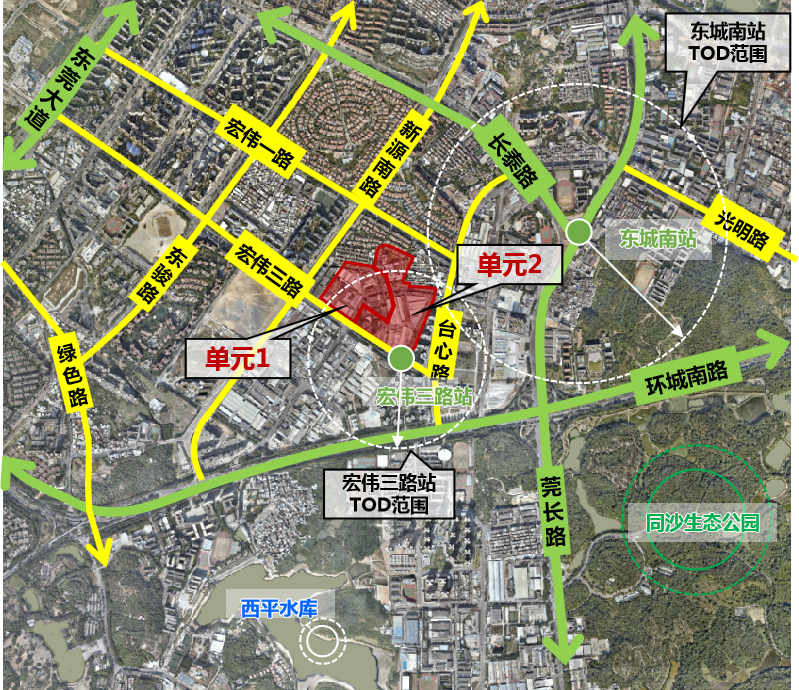 东莞地铁R1线新源路站、R1线与R2线唯一交汇站点鸿福路站,均约500m距离(数据源于东莞东城官微)。