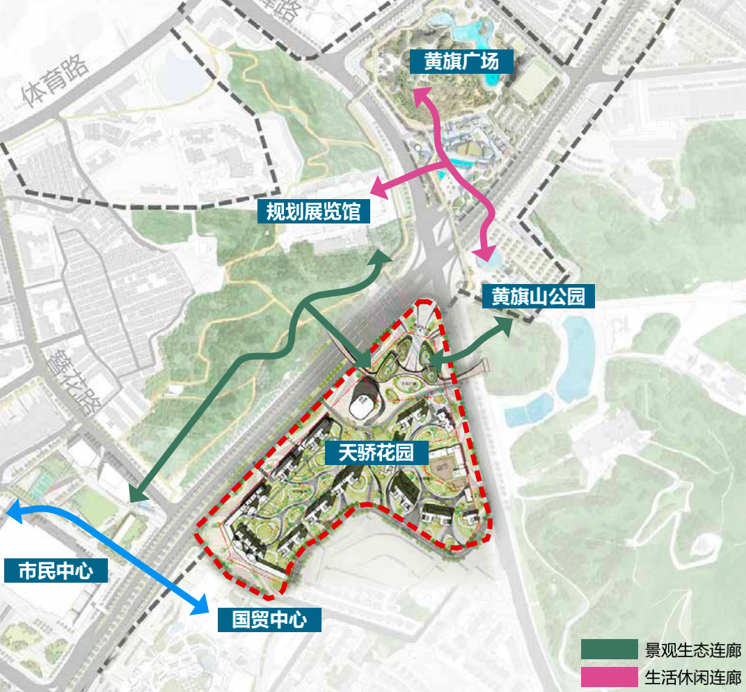 项目占据东城与南城交界处的重点区位,周边有黄旗山公园、黄旗广场、市政府中心广场、国贸城等配套。