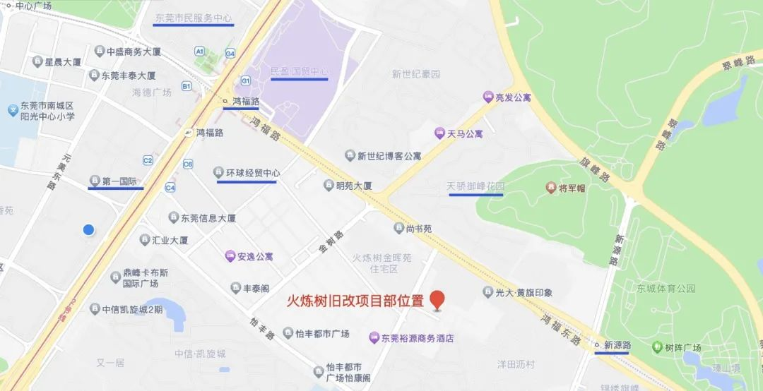 火炼树旧改项目位于东莞市中心城区核芯位置,东至泰和商业街--景湖春天--洋田沥村、南至怡丰路、西至银树路、北至黄旗印象--金晖苑--明苑大厦。