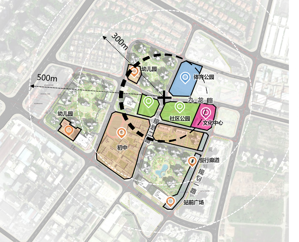 在片区中部(九龙路与规划二路交汇处)集中设置绿地、体育、文化、教育等公共服务设施和商业设施,通过慢行空间引导、二层连廊等控制,打造以人为本、功能复合的公共服务和活动中心。