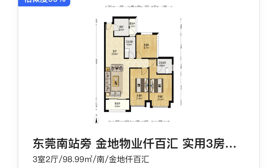 业主直售东莞塘厦金地仟百汇二手新房,3房2厅2卫99平双阳台,中间楼层,视野开阔,光线充足,朝向好!朝南!该房布局合理,空间利用率高浪费少!无欠款!