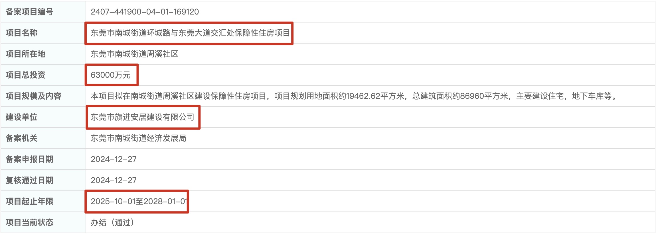 广东政务服务网备案信息显示,项目总投资约6.3亿,建设单位为东莞市旗进安居建设有限公司。