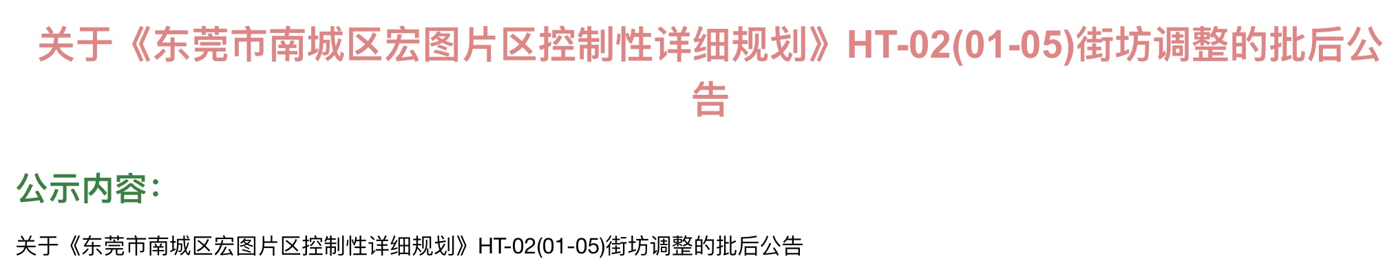 -- 关于《东莞市南城区宏图片区控制性详细规划》HT-02(01-05)街坊调整的批后公告