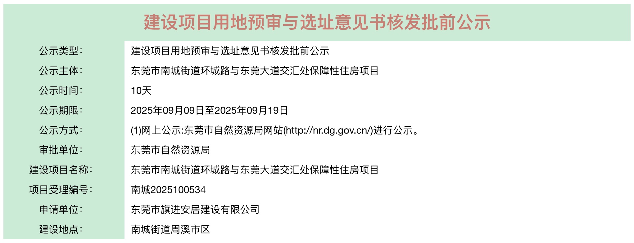 -- 东莞市南城街道环城路与东莞大道交汇处保障性住房项目用地预审与选址意见书核发批前公示