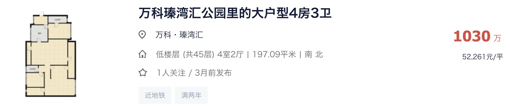 -- 万科瑧湾汇,目前挂牌房源共有2套,最大面积约为197.09m²,单价约5.22万/m²。
