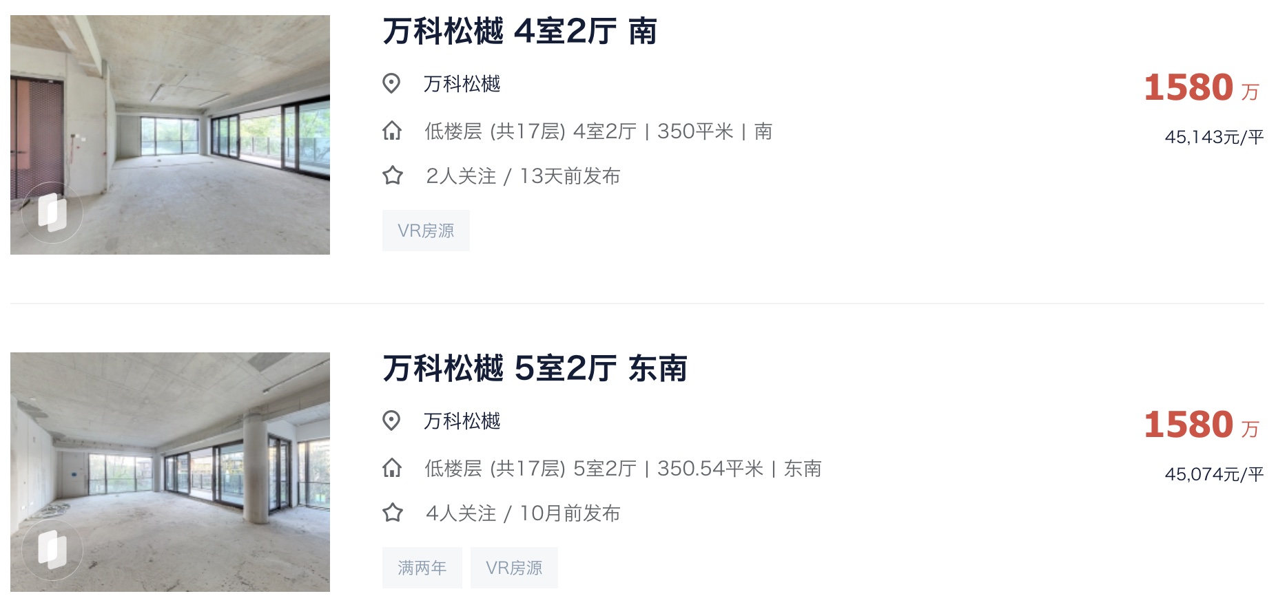 -- 万科松樾,目前挂牌房源最小面积约为350m²,起步单价约4.5万/m²。