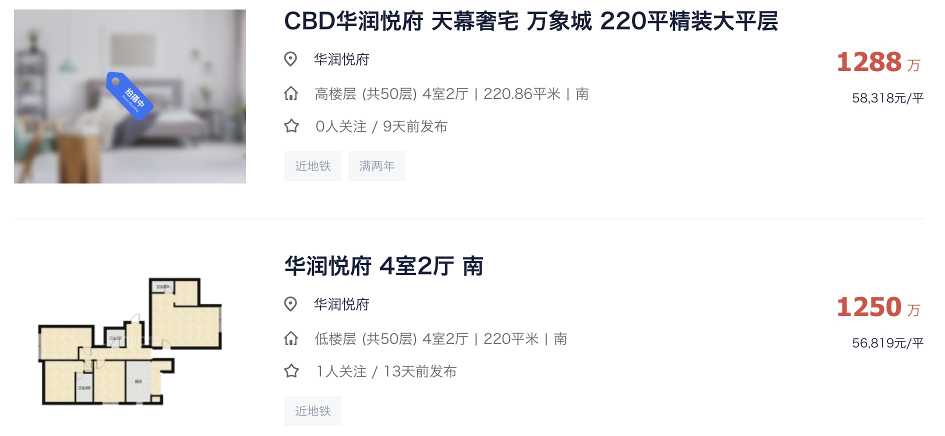 所有房源面积都是约220m²,价格跨度却挺大的,原因应该在于楼层、朝向等等。