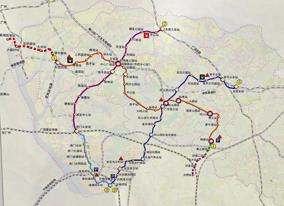线路串起洪梅、望牛墩、道滘、万江、南城、东城、大岭山、松山湖、大朗、黄江共10个镇街,在2号线一二期鸿福路站(市民中心站)实现换乘。