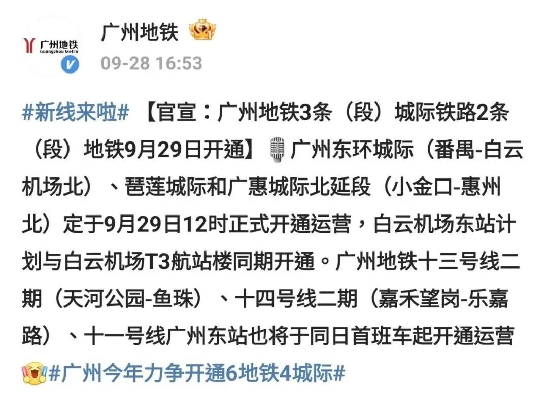 广州东环城际(番禺-白云机场北)、琶莲城际铁路(穗莞深城际琶洲支线)、广惠城际北延段(小金口-惠州北),3条新城际正式开通运营。